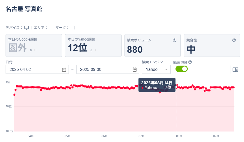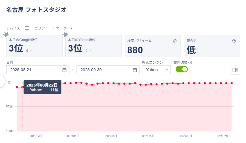 フォトスタジオ・写真館を探すことを目的とした検索キーワードのため、非常に見込み度が高く、最優先で狙うべきキーワードです。
