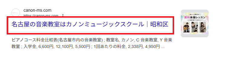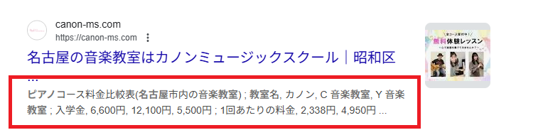 なので、descriptionタグには狙っているキーワードに加えて、他の業者にはない独自の音楽教室・音楽スクールに関する魅力を入れるようにしましょう。
