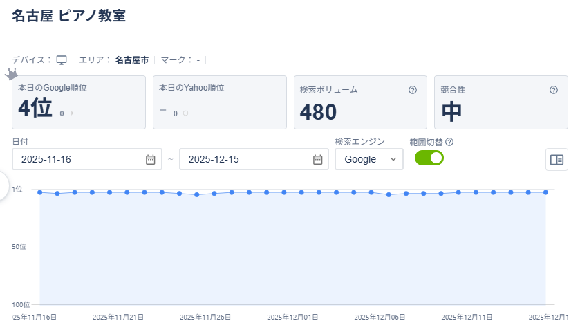 音楽教室・音楽スクールを探すことを目的とした検索キーワードのため、非常に見込み度が高く、最優先で狙うべきキーワードです。