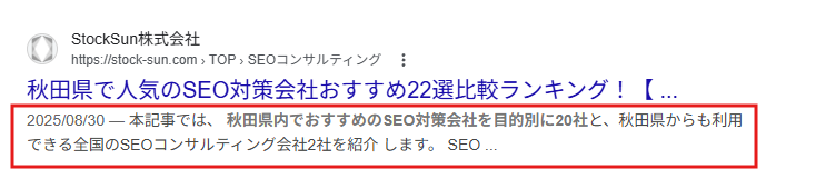 検索結果でタイトルの下に表示される説明文です。 ここは順位に直接影響しませんが、「クリック率」を左右します。