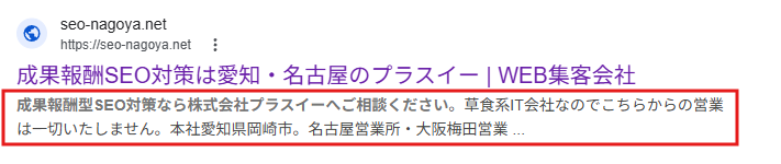 タイトルの下に表示される紹介文です。 ここは直接の順位には関係ありませんが、クリック率を大きく左右します。 「福島県全域対応。見積もり無料。創業30年の実績と信頼で、あなたの悩みを解決します。今すぐお電話ください!」といった、思わずクリックしたくなる「ベネフィット」を盛り込んでください。正直、ここが魅力的でないと、1位になっても誰にも見てもらえません。