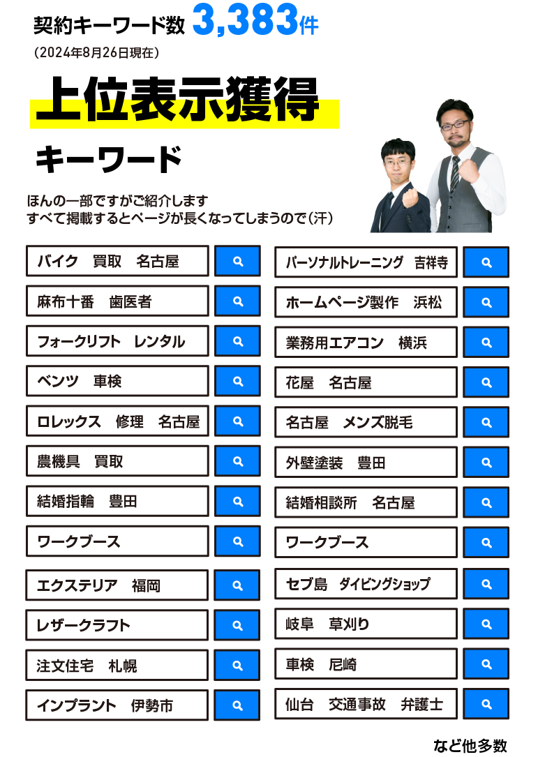 • 自信があるから完全成果報酬で上位表示実現します。※上位表示できなければ、料金は一切発生いたしません。
